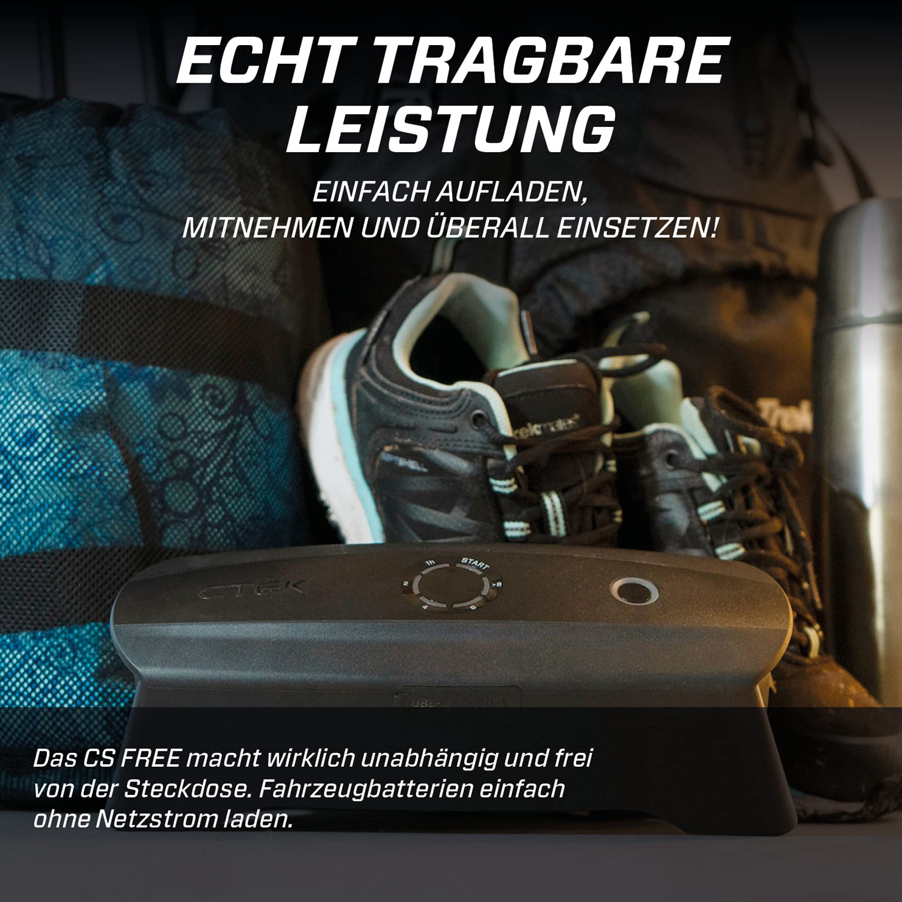 Einzelheiten: Das CS FREE ist das weltweit erste uneingeschränkt portable Ladegerät und Wartungsgerät mit Adaptive Boost, mit dem Sie Ihre entladene Batterie schnell und sicher wieder in Betrieb nehmen können -und das ohne Netzstrom. Das Gerät ist mit anderen Worten eine 12-V-Powerbank, das sowohl für Blei-Säure-Batterien als auch Lithium-Ionen-Batterien (LiFePO₄ mit 12 V) geeignet ist. Und zudem lädt es auch Ihre mobilen Geräte wie Smartphones, Laptops und Kameras nach. Einfach aufladen, mitnehmen und überall einsetzen!