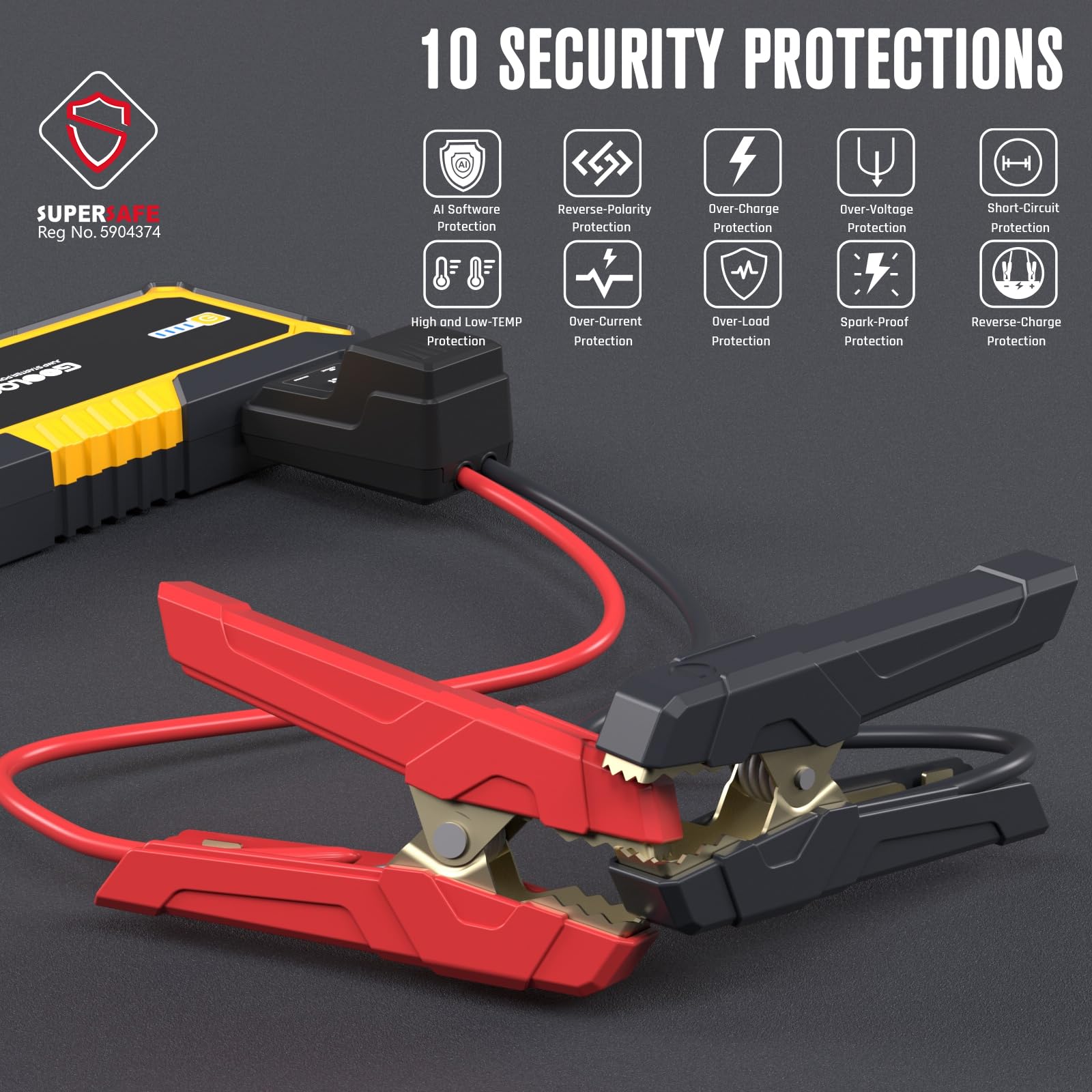 - Sicherheit & Qualität Metallklammern - Eingebaute 10 Arten von Schutz, befreien Sie sich von Missbrauch und Funken. Wir wollten sicherstellen, dass sich unsere Benutzer bei der Verwendung unseres Produkts zu 100 % sicher fühlen. Das GOOLOO GP4000 Smart Jumper Cable ist mit Ganzmetallklemmen konstruiert, um Schäden durch langfristigen Gebrauch zu vermeiden.