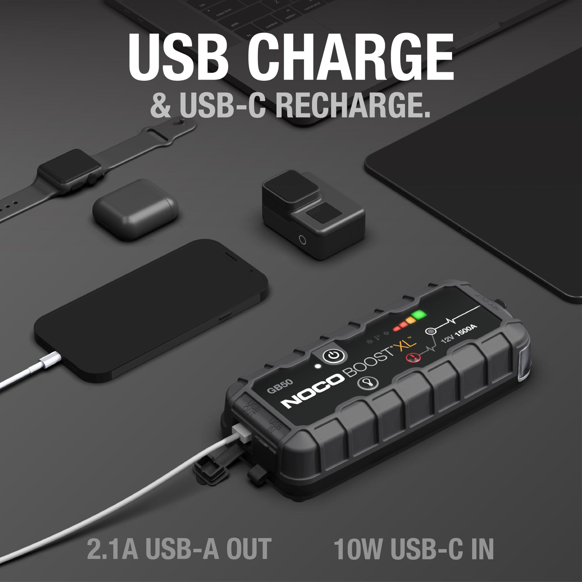 - LIEFERUMFANG – Enthält eine GB50 Starthilfe Powerbank, robuste Booster-Klemmen, USB-C-Ladekabel und Mikrofasertasche. Entwickelt in den USA, 1 Jahr Garantie inklusive.