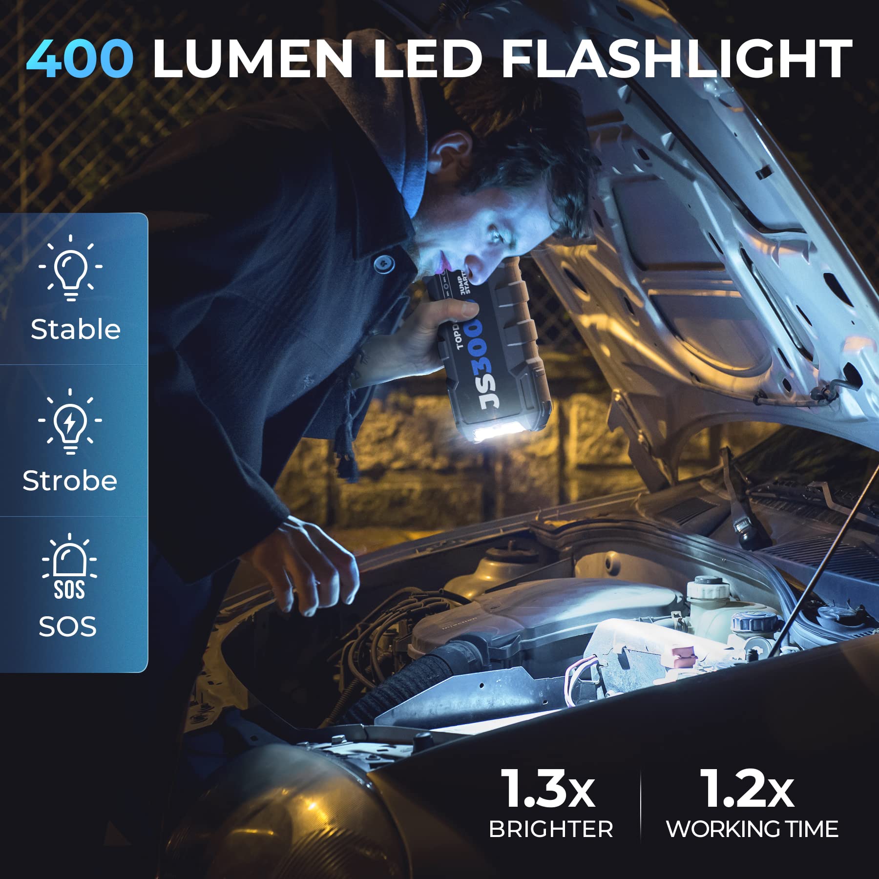 - ➤MEHR ALS EIN STARTHILFEGERÄT: Der JS3000 dient auch als tragbare 24000mAh Powerbank mit 2 USB QC 3.0 Anschlüssen, einem 16.8V Gleichstromanschluss und einem bidirektionalen Typ C PD45W-Ladeanschluss (lädt Ihren Laptop in 2 Stunden von 0 % auf 100 % oder andere Geräte in 1 Stunde). Sie verfügt über eine superhelle Taschenlampe mit einer Lichtstärke von 400 Lumen, ein SOS-Signallicht für Notfälle oder Outdoor-Abenteuer. Wenn sie vollständig aufgeladen ist, kann die Taschenlampe bis zu 30 Stunden lang eingeschaltet bleiben.