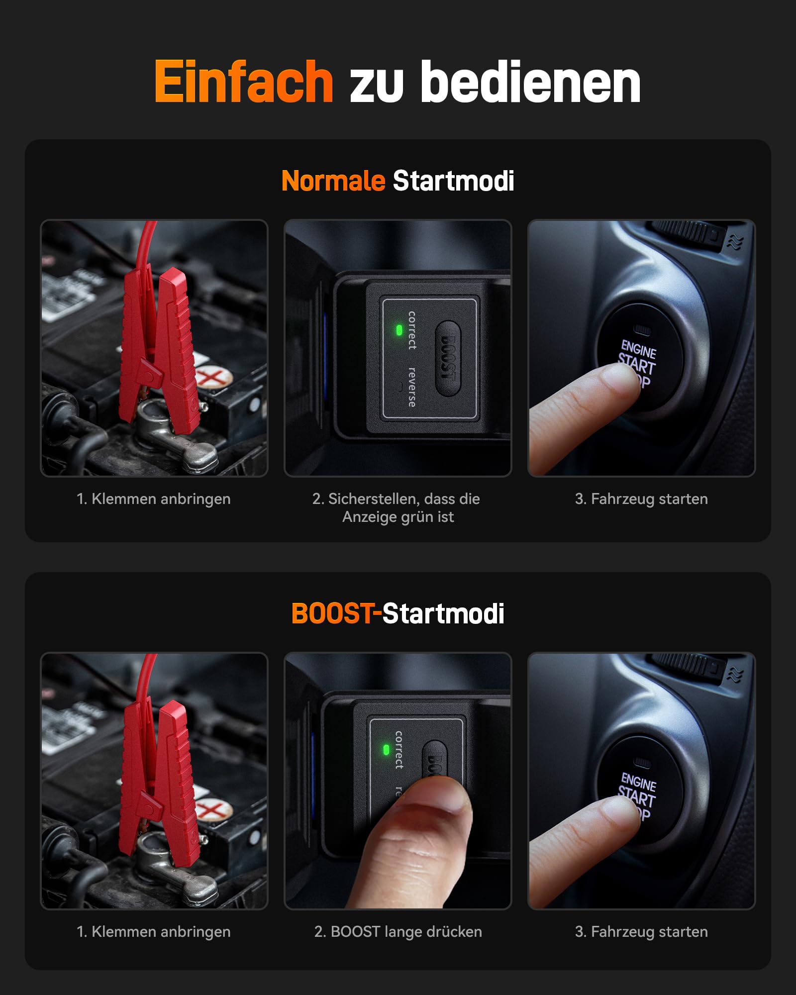 - Booster & 400-Lumen-Leuchten – Bietet einen leistungsstarken Booster zum Starten von Fahrzeugen bei Niederspannung und ist mit seiner 400-Lumen-LED-Taschenlampe 3-5 mal heller als herkömmliche Geräte. Mit Not-, Blitz- und Fernlichtmodus ist es ein unverzichtbares Notfallgerät