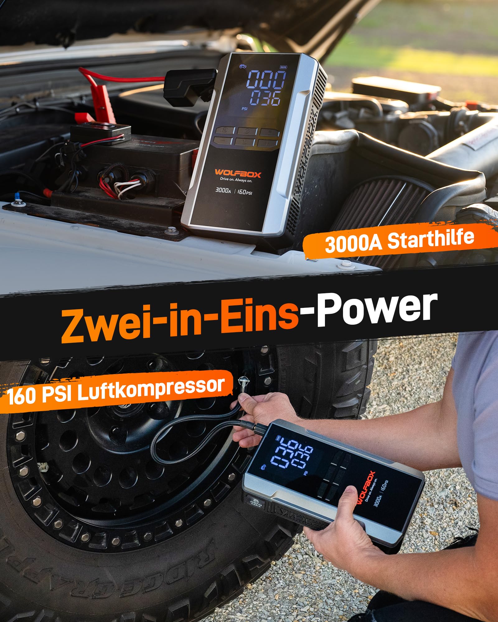- Starthilfegerät und Kompressor in einem – Eingebauter 16000-mAh-Akku und ein Spitzenstrom von 3000A ermöglichen das Starten einer völlig leeren 12-V-Autobatterie (bis zu 8 l Benzin- oder 6 l Dieselmotoren). Es kann auch die Reifen von Pickups und kleineren Fahrzeugen aufpumpen und vereint so mehrere Funktionen in einem Gerät.