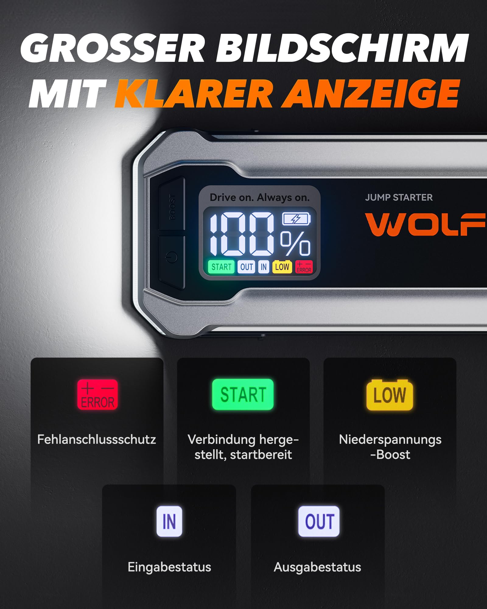 WOLFBOX Starthilfe Powerbank 4000A, 12V Auto Starthilfe (Bis zu 10L Benzin oder 10L Diesel) mit LED-Taschenlampe, großen Bildschirm,Starthilfekabel, Autobatterie Booster für SUV, LKW, Motorräder